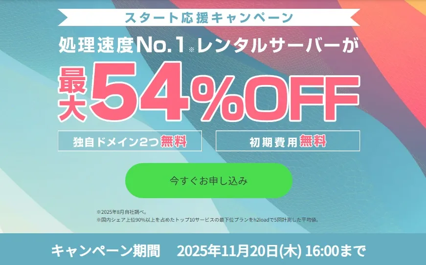 | 2025/08/22(金) | スタート応援キャンペーン | こちら | 全プラン/全契約期間で割引き(最大54%OFF) |