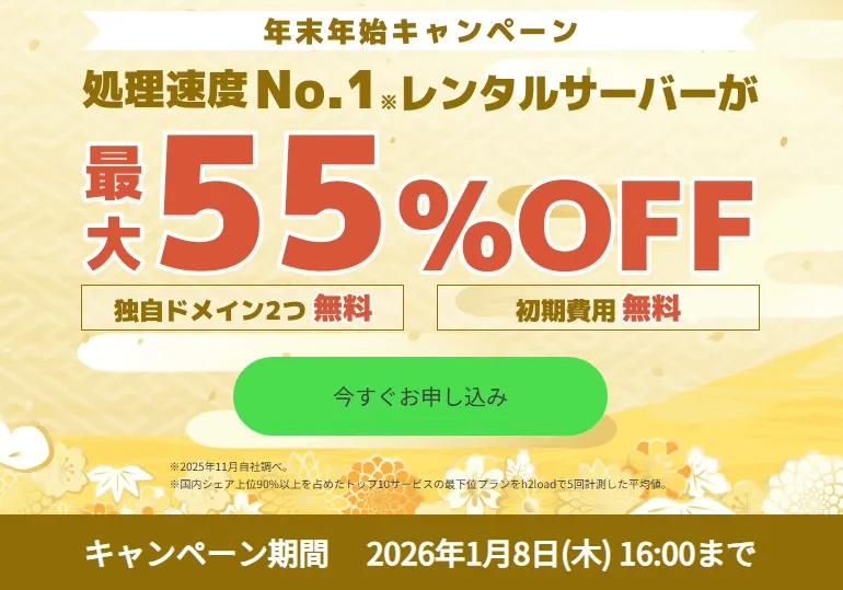 | 2026/1/8(木) | 年末年始キャンペーン | こちら | 全プラン/全契約期間で割引き(最大55%OFF) |